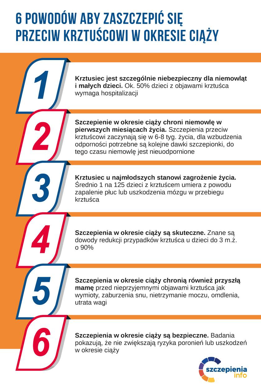 od 15 października 2024r. w Polsce dostępne jest bezpłatne, zalecane szczepienie przeciw krztuścowi dla kobiet w ciąży. Do tej pory szczepienie było odpłatne. Szczepienie jest zalecane po ukończeniu 27. do 36. tygodnia ciąży, a w uzasadnionych przypadkach zagrożenia przedwczesnym porodem – po ukończeniu 20. tygodnia ciąży.